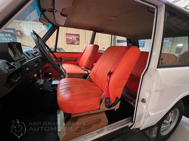 LAND ROVER RANGE ROVER SUFFIX A V8 ESSENCE 2 portes en 5 places blanc sellerie orange configuration très originale et très sympa avec son livret de bord. Véhicule entièrement révisé et près à prendre la route des vacances.