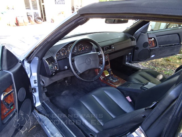 Mercedes Roadster SL 500 V8 en 4 places cabriolet avec capote en alpaga et hard top du 04.09.1990 affichant 157800km bleu sellerie cuir noir avec son double de clefs et son carnet d'origine contenant son historique d’entretien. Full options, sièges électriques à mémoires, suspension pilotée, colonne de direction électrique, rétroviseur intérieur électrique jour nuit. Peinture neuve. Avec contrôle technique valide.