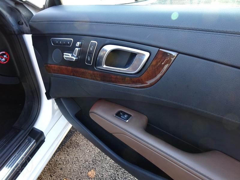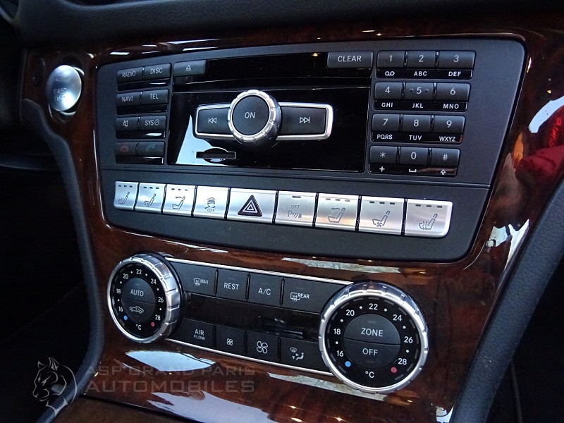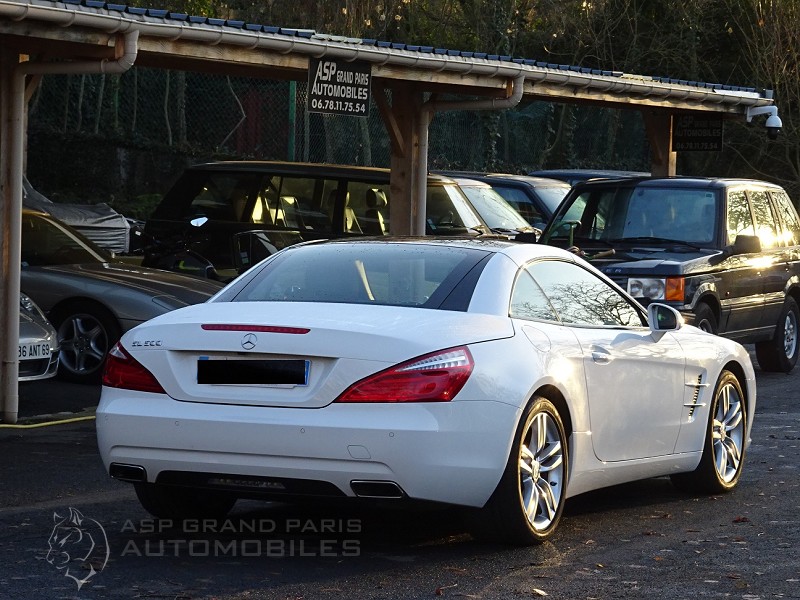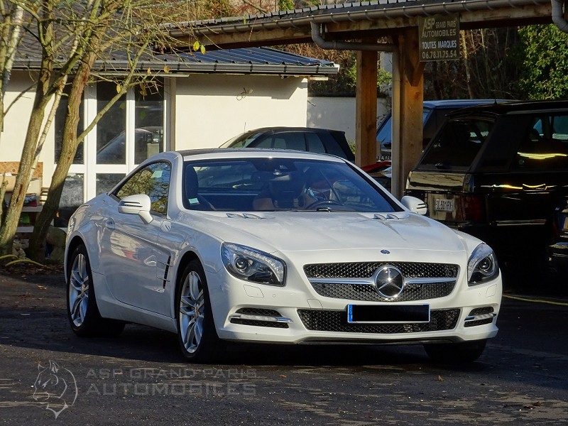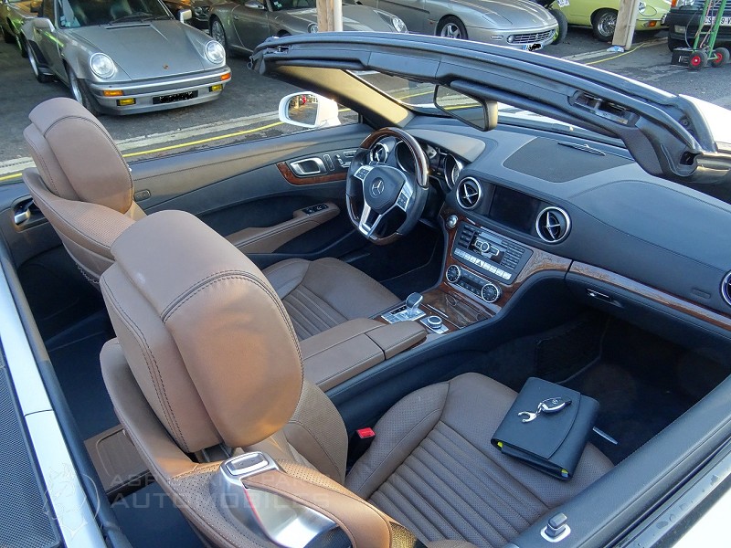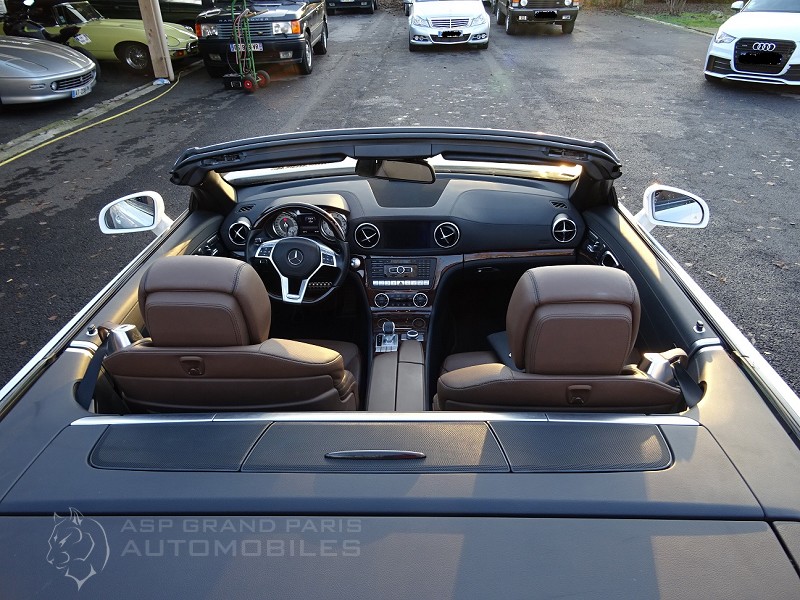 Roadster Mercedes 500 SL blanc polaire, sellerie full cuir marron passe poils foncés, finition bois, volant à réglage électrique, volant cuir et bois, distronic plus, vision de nuit, toit panoramique, sièges chauffants et ventilés, système audio, jantes aluminium 18 pouces, suspension active ABC, aides aux stationnements, pare vent électrique, GPS téléphone, chauffage de la nuque, démarrage sans clefs neufs. Voiture Française avec son carnet, historique de factures et double de clefs.