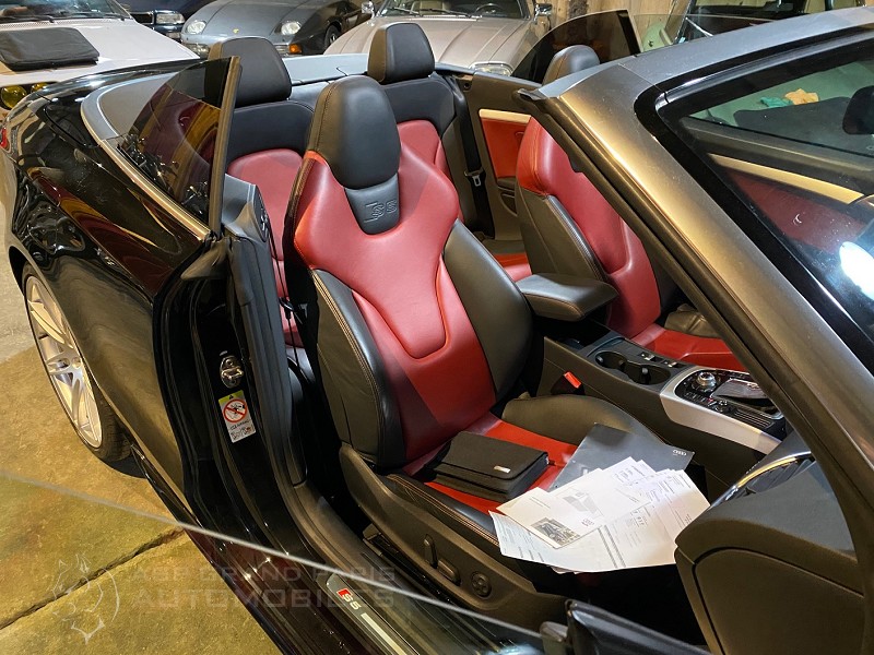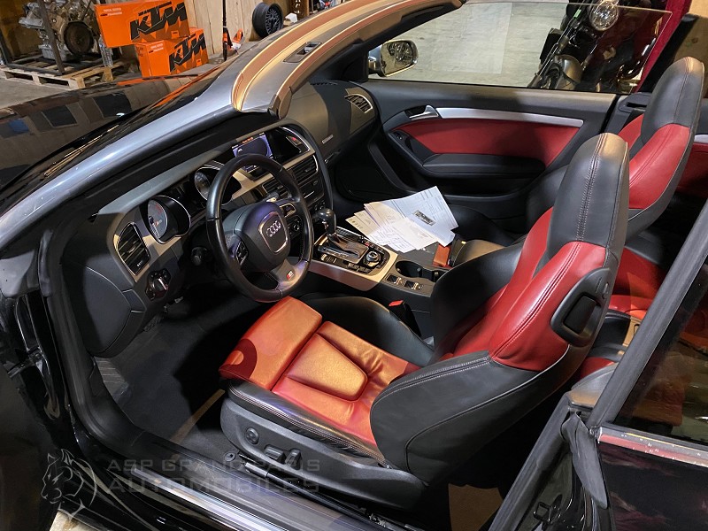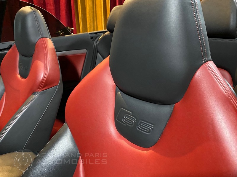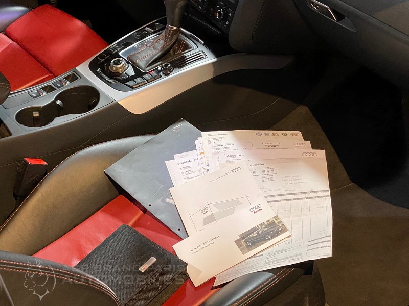 AUDI S5 QUATTRO S TRONIC V6 TFSI 333CV avec un faible kilométrage. Noir métal sellerie cuir noir et rouge, système audio, volant cuir multifonctions, jantes aluminium, sellerie full cuir sièges électriques chauffant, GPS 16/9, radars de stationnement, phares xénon. Cette voiture dispose de son carnet et double de clefs, 4 pneus neufs.