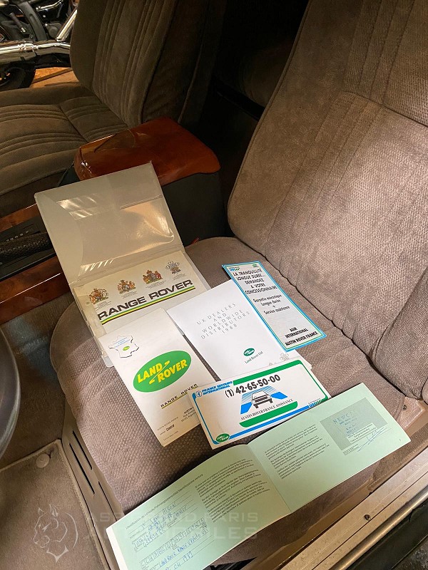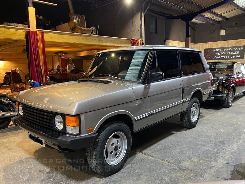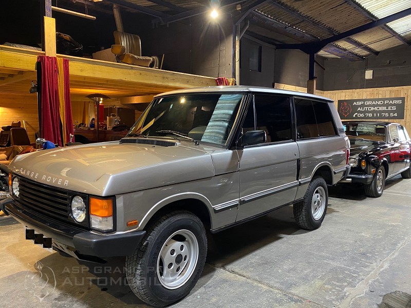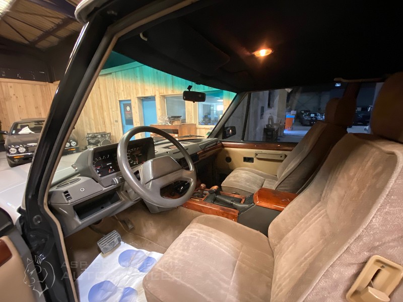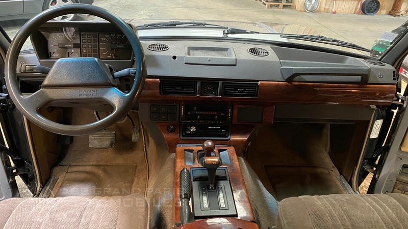 Range Rover Classic V8 injection 2 portes boite automatique, gris métal sellerie velours beige, climatisation, jantes aluminium. Cette voiture affichait 102800 kilomètres lors du début de sa remise en condition.