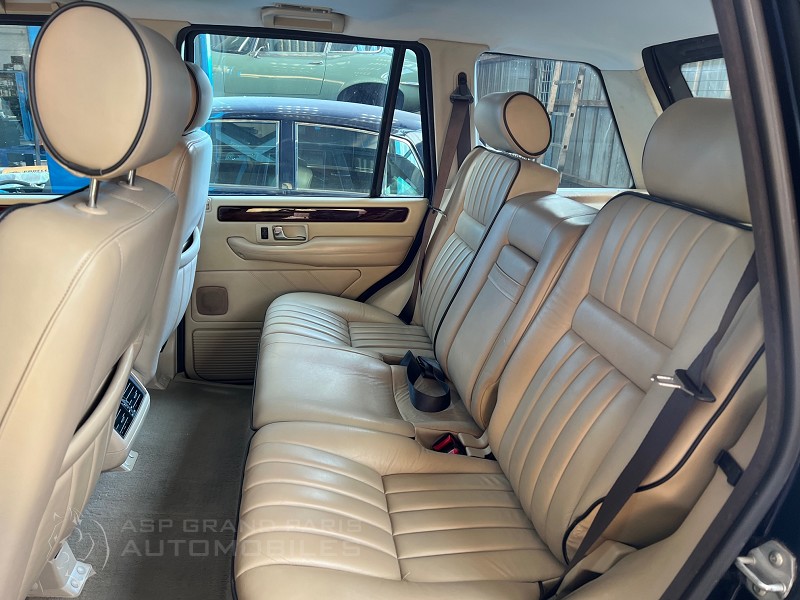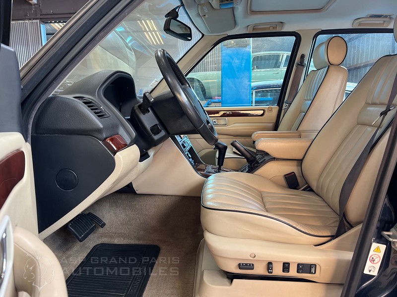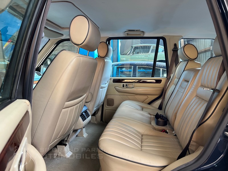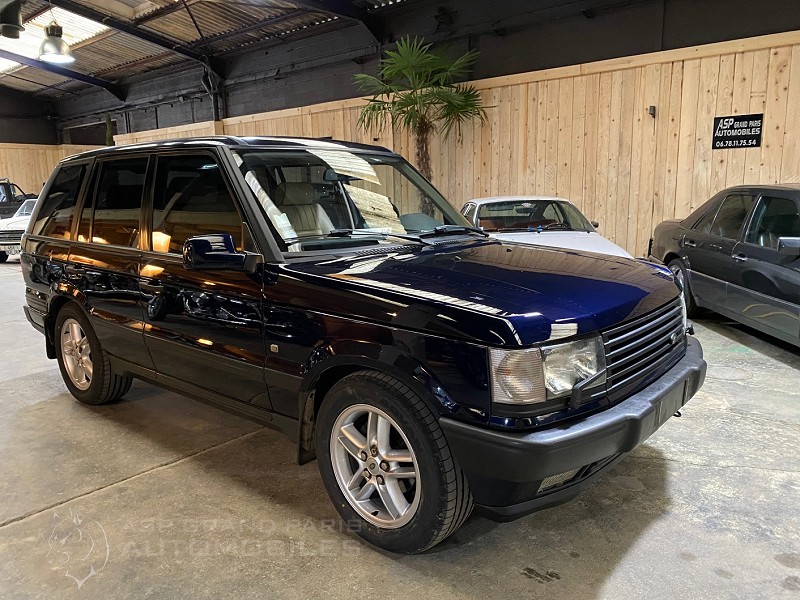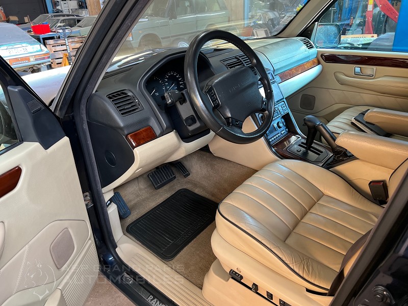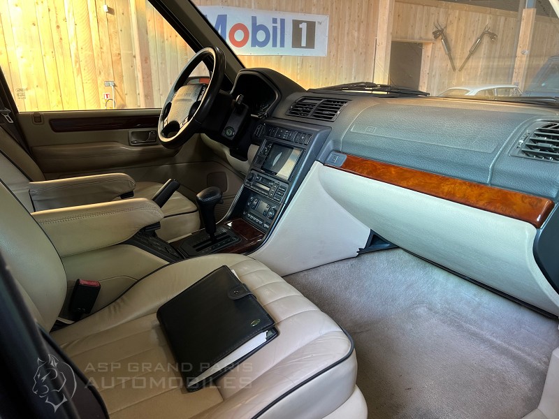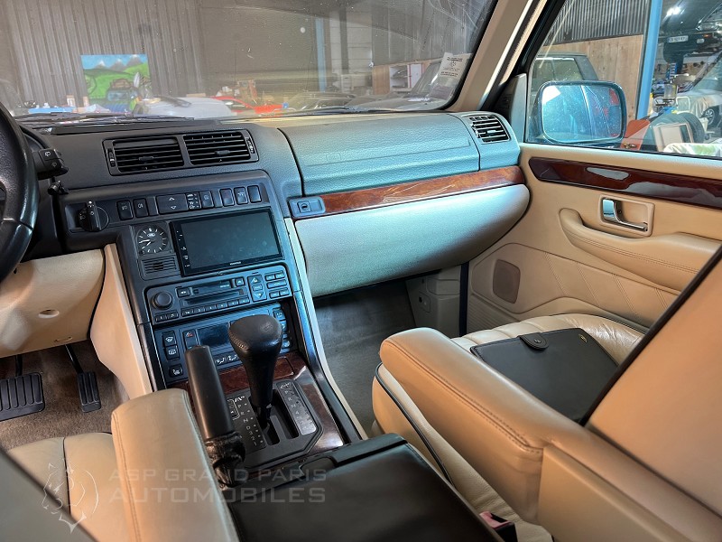 Range Rover P38 Vogue V8 4.6 avec son carnet et double de clés, kilomètres compteur 165000km lors de sa restauration. Bleu métal sellerie cuir beige, toit ouvrant, sièges chauffants.