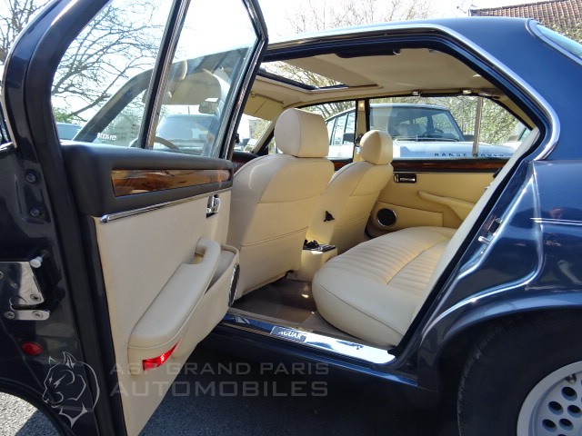 Cette splendide Jaguar Sovereign V12 mise en circulation le 24.1.1991 avec seulement 77800km au compteur, bleu métallisé sellerie cuir beige sans la moindre trace. Cette Jaguar se trouve dans un bel état, les boiseries brillent comme au 1er jour et sont dans un état exceptionnel, excellent comportement routier.